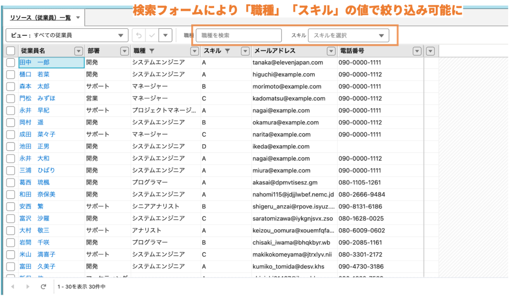 まずは、フローの中で利用したいMashmatrix Sheetのブックとシートを用意します。 今回は、アサイン候補となる「リソース(従業員)一覧」シートを作成し、検索フォームで職種・スキルの値で絞り込みができるようにしました。