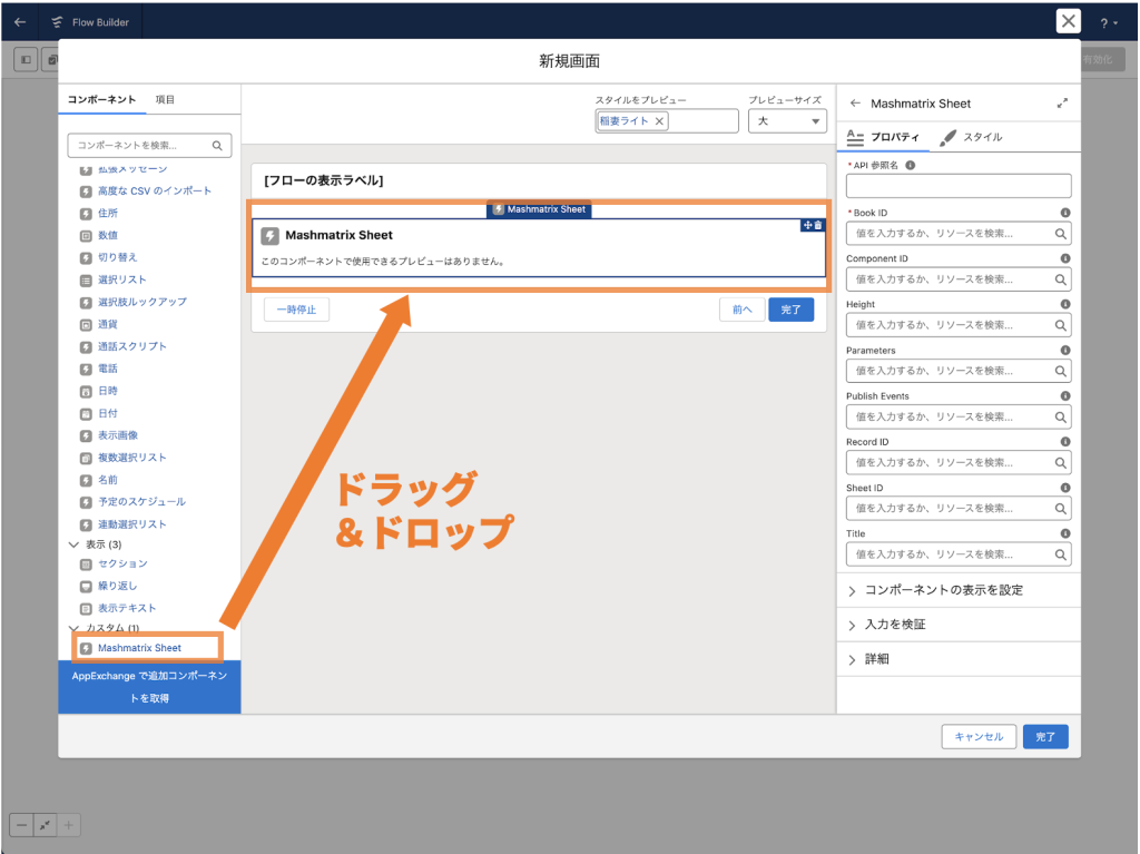 3.次に、左側のコンポーネント一覧から、カスタムコンポーネントの 「Mashmatrix Sheet」 を探し、画面中央へドラッグ&ドロップする