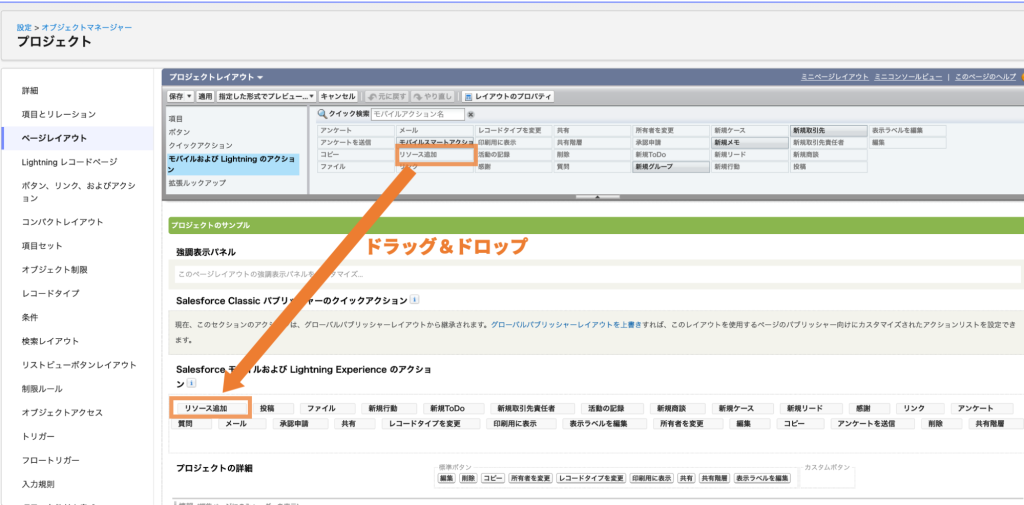4.アクションが作成できたので、該当のオブジェクトのページレイアウトに配置する