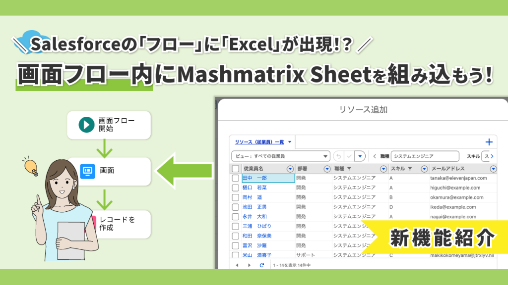 今回は、Mashmatrix Sheetの新機能「画面フロー内でのSheetコンポーネント利用」についてご紹介しました。今回のアップデートによって、Mashmatrix Sheetの「柔軟なデータ一覧・抽出の機能」と、Salesforceフローの「自動化」をシームレスに融合させることが可能になりました。