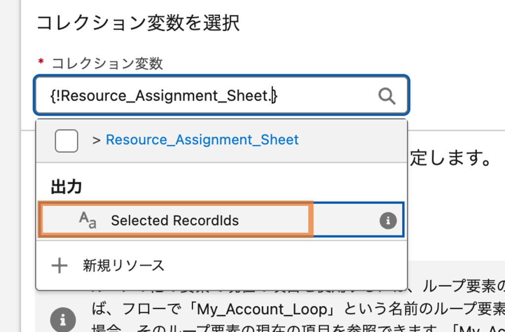 (今回の例では、複数のレコードを一括選択するので「Selected RecordIds」出力パラメータに設定します)