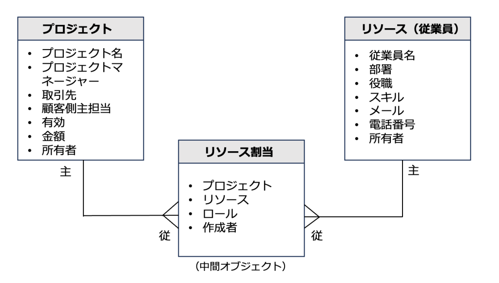 「プロジェクト」と「リソース」の間に、「リソース割当」というジャンクション(中間)オブジェクトを介した多対多の構造になっています。