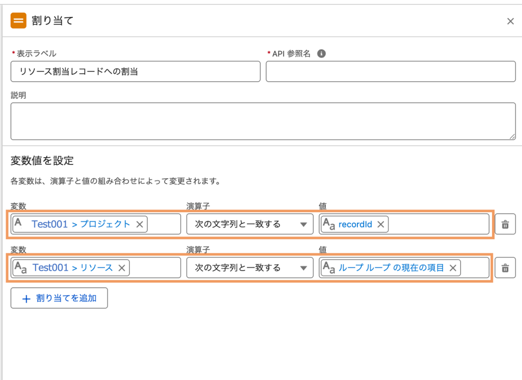 - 「リソース割当」レコードをループ処理で複数作成して保存する