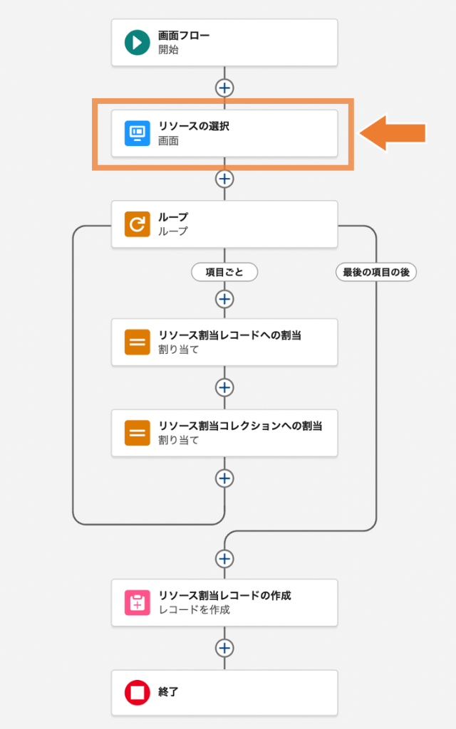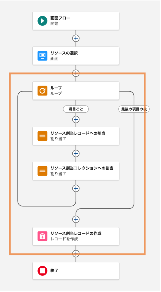 続いて、選択された「リソース」のレコードIDに紐づく「リソース割当」レコードをループ処理で複数作成し、保存する処理をフローに追加します。