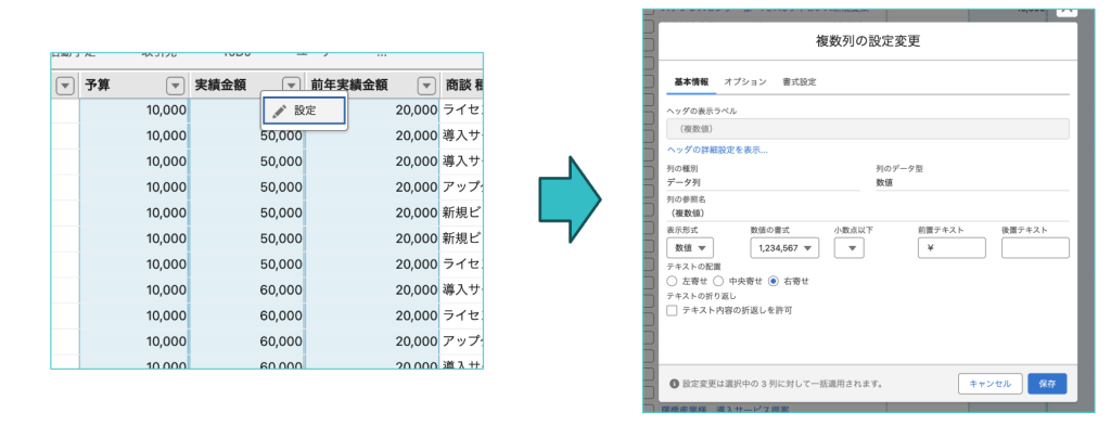 などの、複数の列に共通する設定項目をまとめて変更できるようになりました。シートの列を Shift キーや Ctrl (Command) +クリックで複数選択し、右クリックで表示されたコンテキストメニューから、一括で列設定を変更可能です。