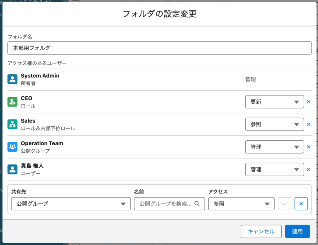 Salesforceのロール、公開グループ、個別ユーザーを共有先として指定できます。フォルダ設定ダイアログから共有先の種別を選択し、名前を検索・追加する直感的な操作で権限を設定できます。