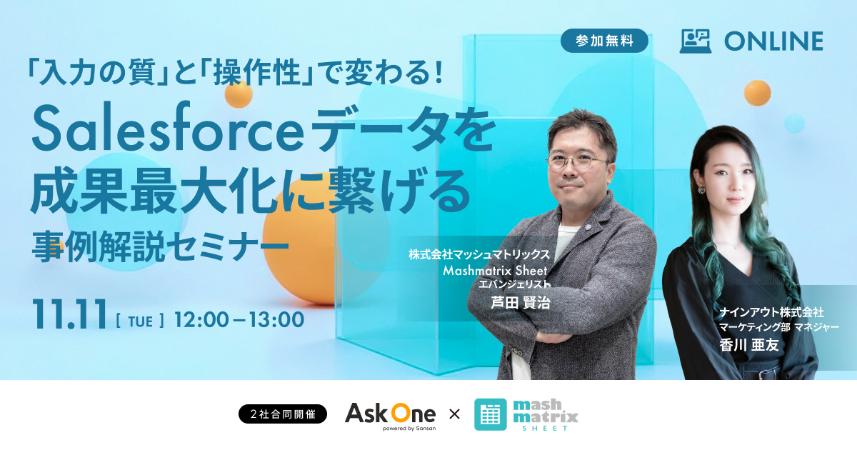 本セミナーでは、Ask Oneを“Salesforceの入力インターフェース”として活用し、入力業務を仕組み化・標準化して正確なデータを効率的に収集する方法を事例とともに紹介します。