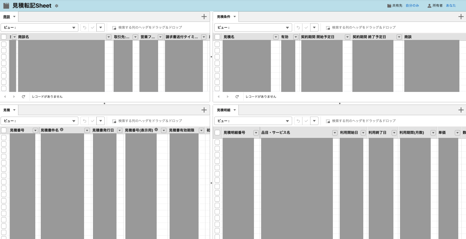 このとき、Salesforceからスプレッドシートへデータを転記しなければならないのですが、情報が複数のオブジェクトにまたがっているため転記作業が大変でした。そこで、4つのオブジェクトを一画面に連動表示させながら、Salesforceからスプレッドシートへ一括編集する仕組みを作りました。