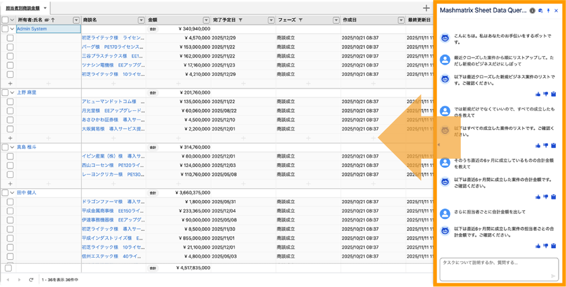 Agentforce エージェントに日本語の文章で指示するだけで、Salesforce 内にあるデータを適切に抽出し、Mashmatrix Sheet の Excel のような画面で一覧表示。画面を見ながら、自然な対話形式で表示データを再構成することもできます。もちろん、表示された画面でExcelライクにデータの編集・更新も可能です。