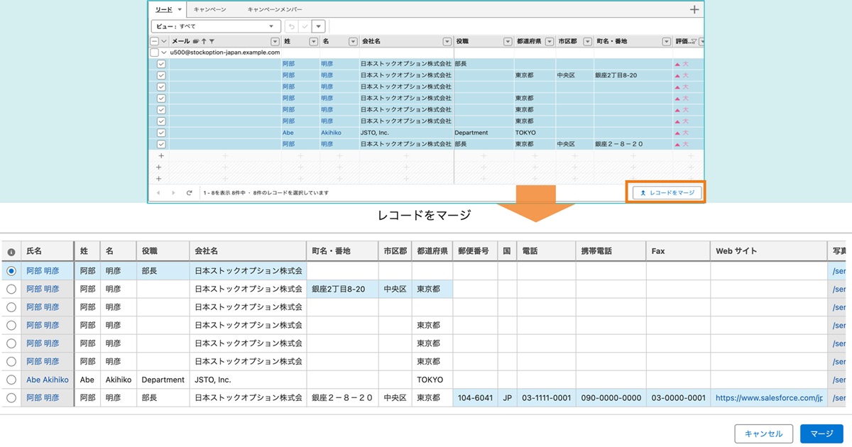 一括マージアクションボタンを配置して、シートに表示中のレコードを最大50件まで同時に統合できます。Salesforceの標準機能でマージ処理をサポートするオブジェクトだけでなく、すべてのオブジェクトに対応。重複候補の抽出から比較、マージまでを一画面で実行できます。