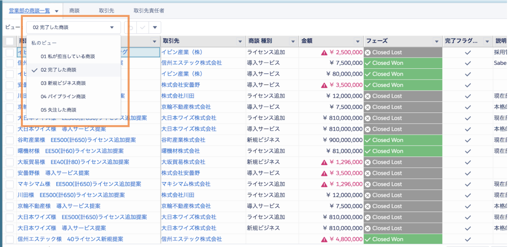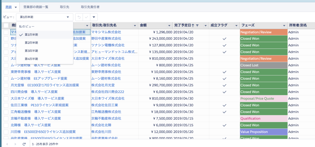 商談のフェーズや商談種別、所有者を絞り込み、それぞれをビューとして保存し表示させています。