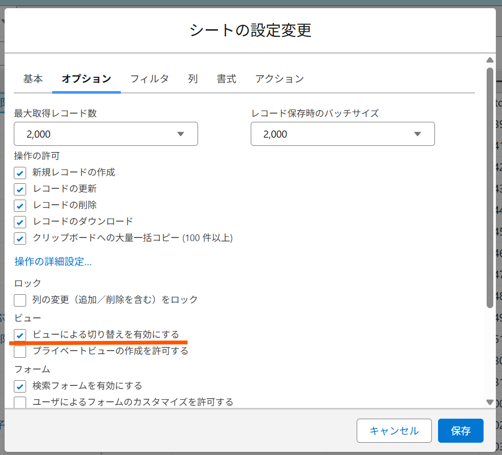 - シートメニュー > 設定 > オプション > ビュー >「ビューによる切り替えを有効にする」にチェックを入れて保存します(通常は初期設定でチェックが入っています)