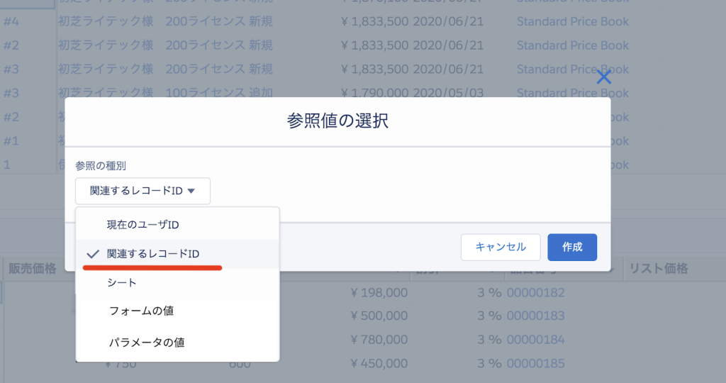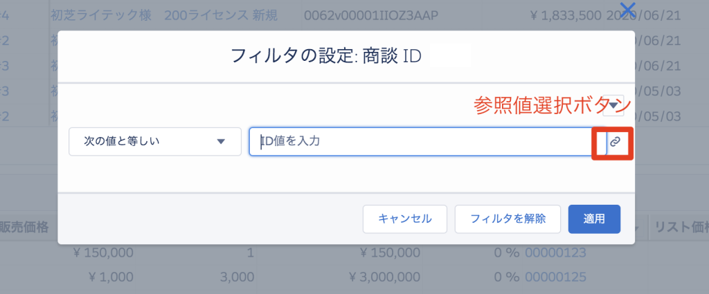 商談ID列の列ヘッダメニュー > フィルタ > 参照値選択ボタン >関連するレコードID>作成