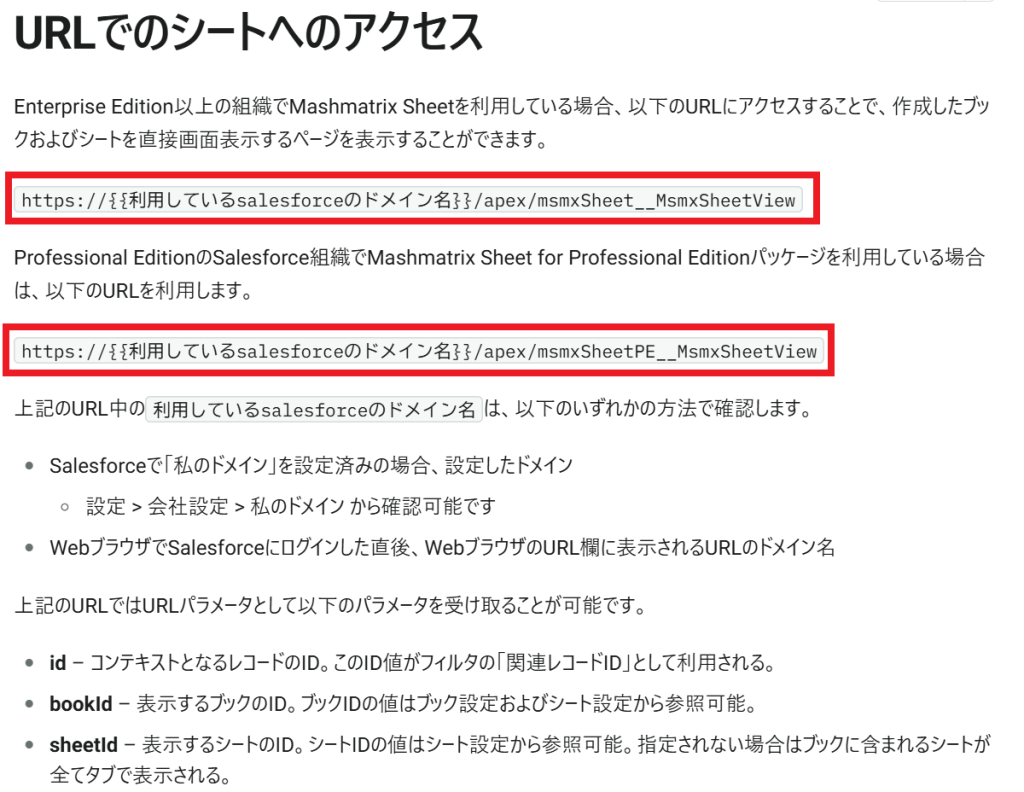 URLパラメータとして「id、bookId、sheetId」を指定することで、関連するレコードID、および表示するシート/ブックを指定できます。