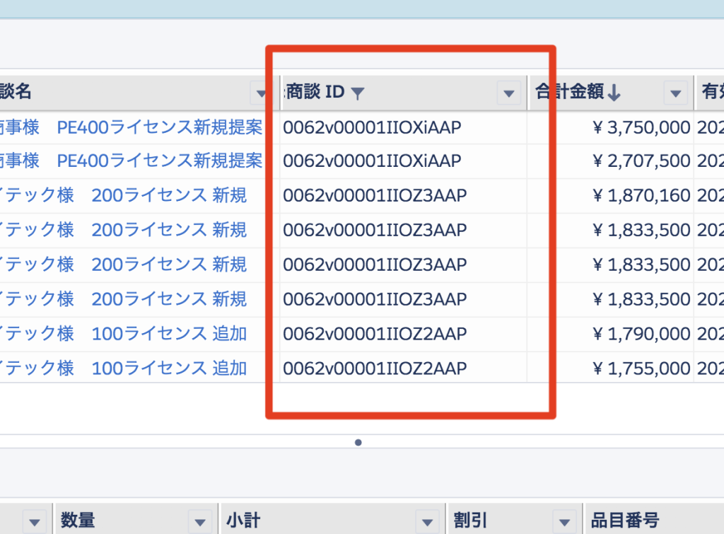 商談ID列が、関連するレコードのIDでフィルタされるように設定されました。(ただし、この画面ではフィルタ後の表示は特に変わりません)