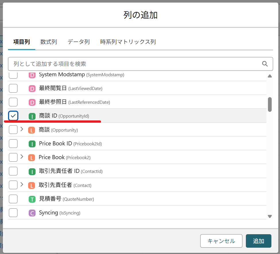 2-1. 列ヘッダメニュー > 列の追加 > 「商談ID」項目を選択して追加