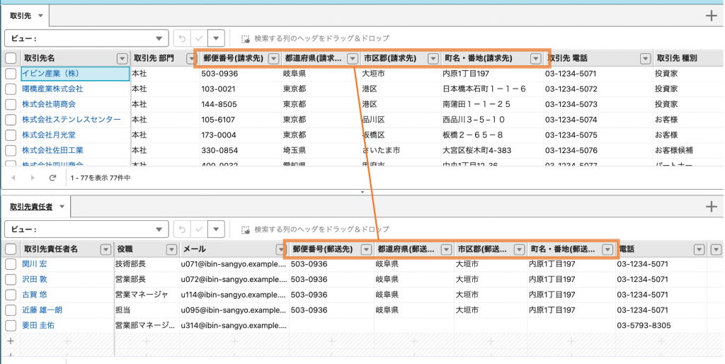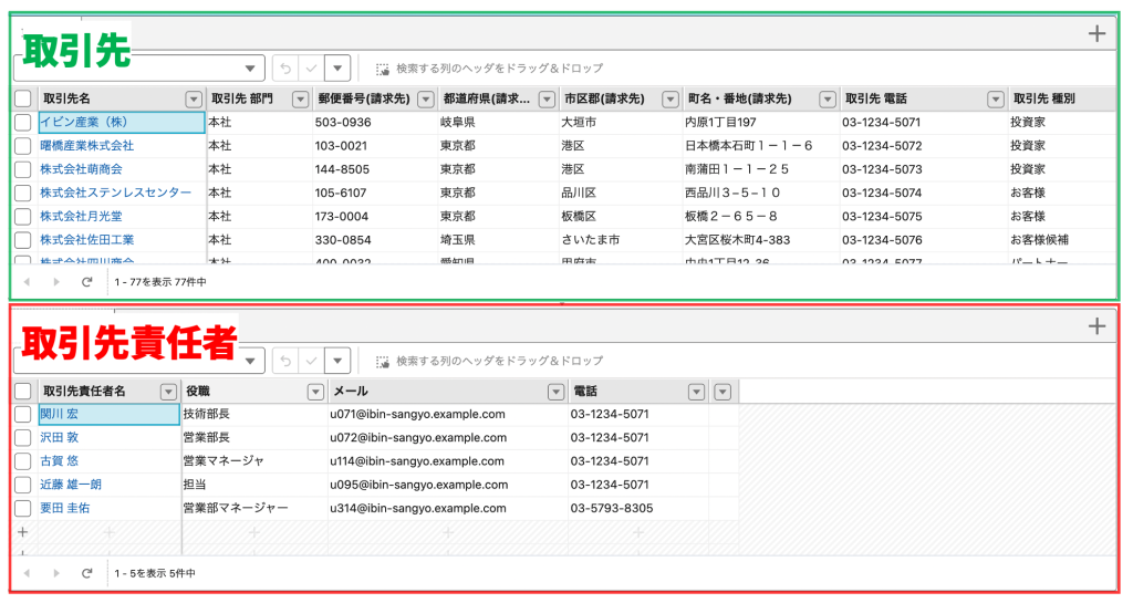 - 親オブジェクト(例:取引先)の一覧から、関連する子オブジェクト(例:取引先責任者)のデータも同じ画面内に表示できます