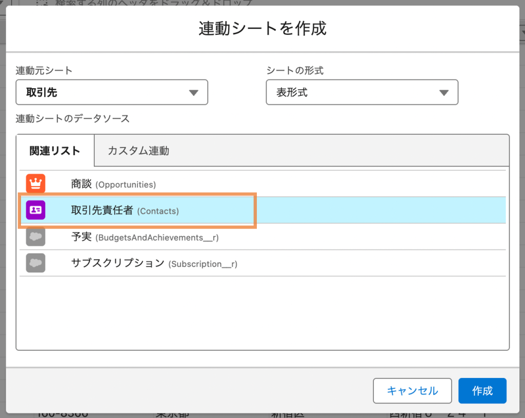 2.連動シートとして追加したい関連オブジェクトを選択する(ここでは「取引先責任者」を選択)