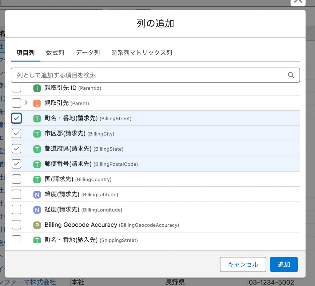 2.次に、住所の項目列(郵便番号、都道府県、市区郡、町名・番地)を追加する
