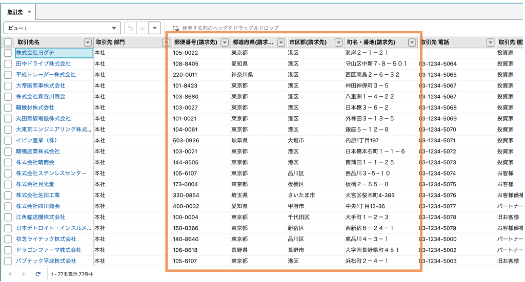 列が追加されたら、「取引先」「取引先責任者」シートの住所項目の並び順を同じにしておいてください(下画像参照)