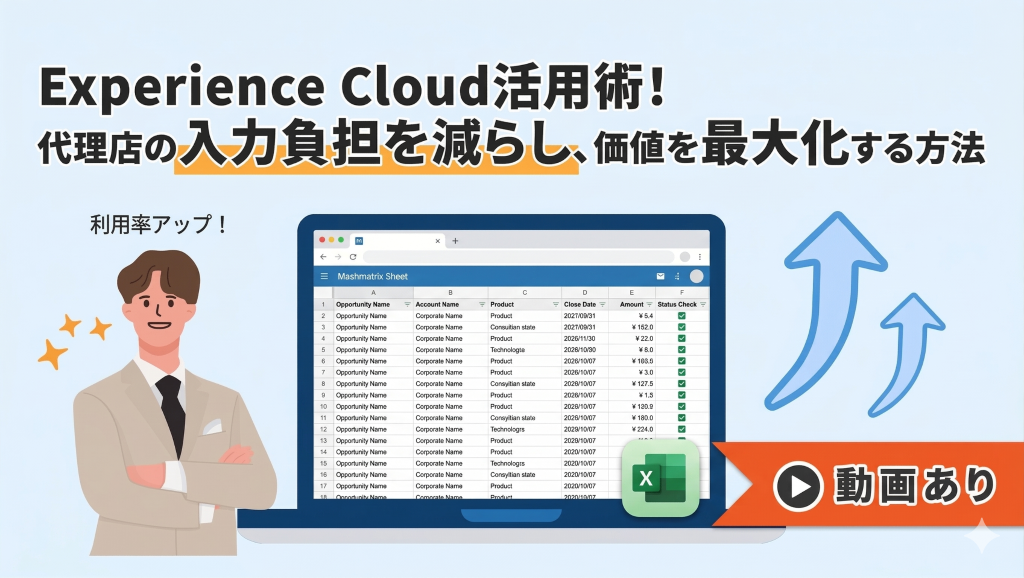 本記事では、SalesforceのデータをExcelのように直感的に操作できる「Mashmatrix Sheet」を活用し、代理店担当者の入力負荷を下げることで、ポータルの利用率とデータの鮮度を同時に引き上げる方法をご紹介します。Experience Cloudで代理店(外部パートナー)の案件管理や情報共有を行っている場合にオススメです!