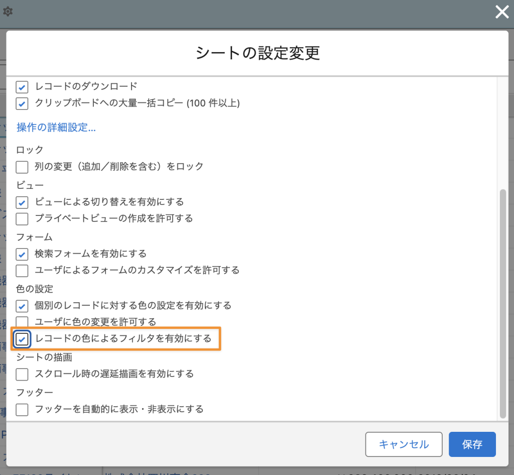 ※レコードの色によるフィルタを有効にするには、シートの設定から「オプション」タブを開き、「レコードの色によるフィルタを有効にする」をチェックする必要があります