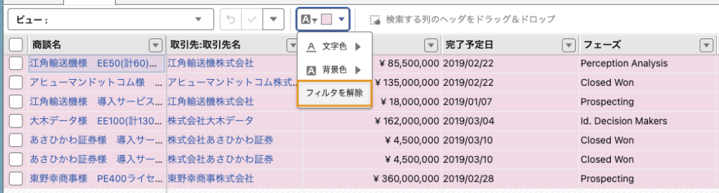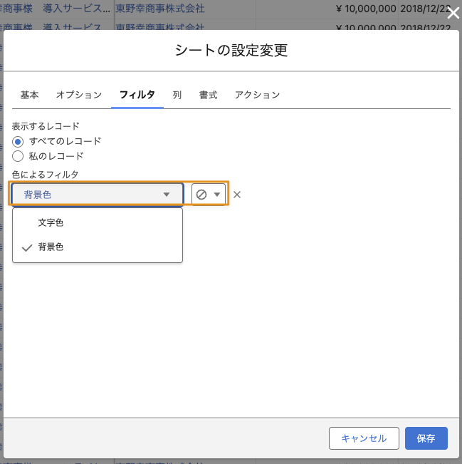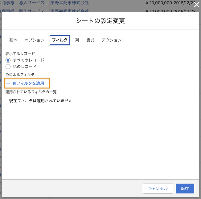 レコードの色の変更やシートの書式設定でレコードに対して色(文字色・背景色)を設定している場合、設定されている色を対象としてフィルタを適用することができます。