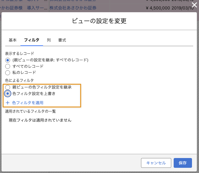 継承関係を持つビューが作成されている場合、子ビューの「フィルタ」では、「親ビューの色フィルタ設定を継承」がデフォルトとして選択されています。