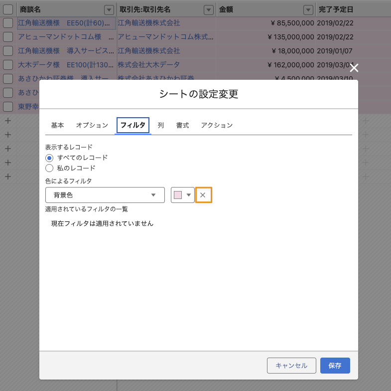 3.シートの設定から色によるフィルタの適用を解除する場合は、「X」ボタンをクリックします