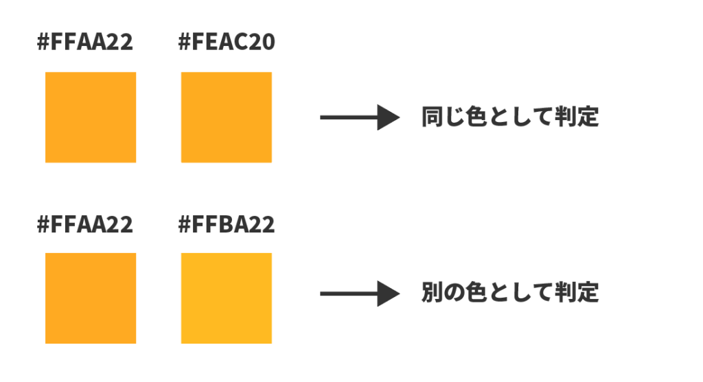 例えば、( #FFAA22 と #FEAC20) は色コードで考えたときに近い色と考えられ同じ色とみなされますが、(#FFAA22 と #FFBA22)は、別々の色として判定されます。
