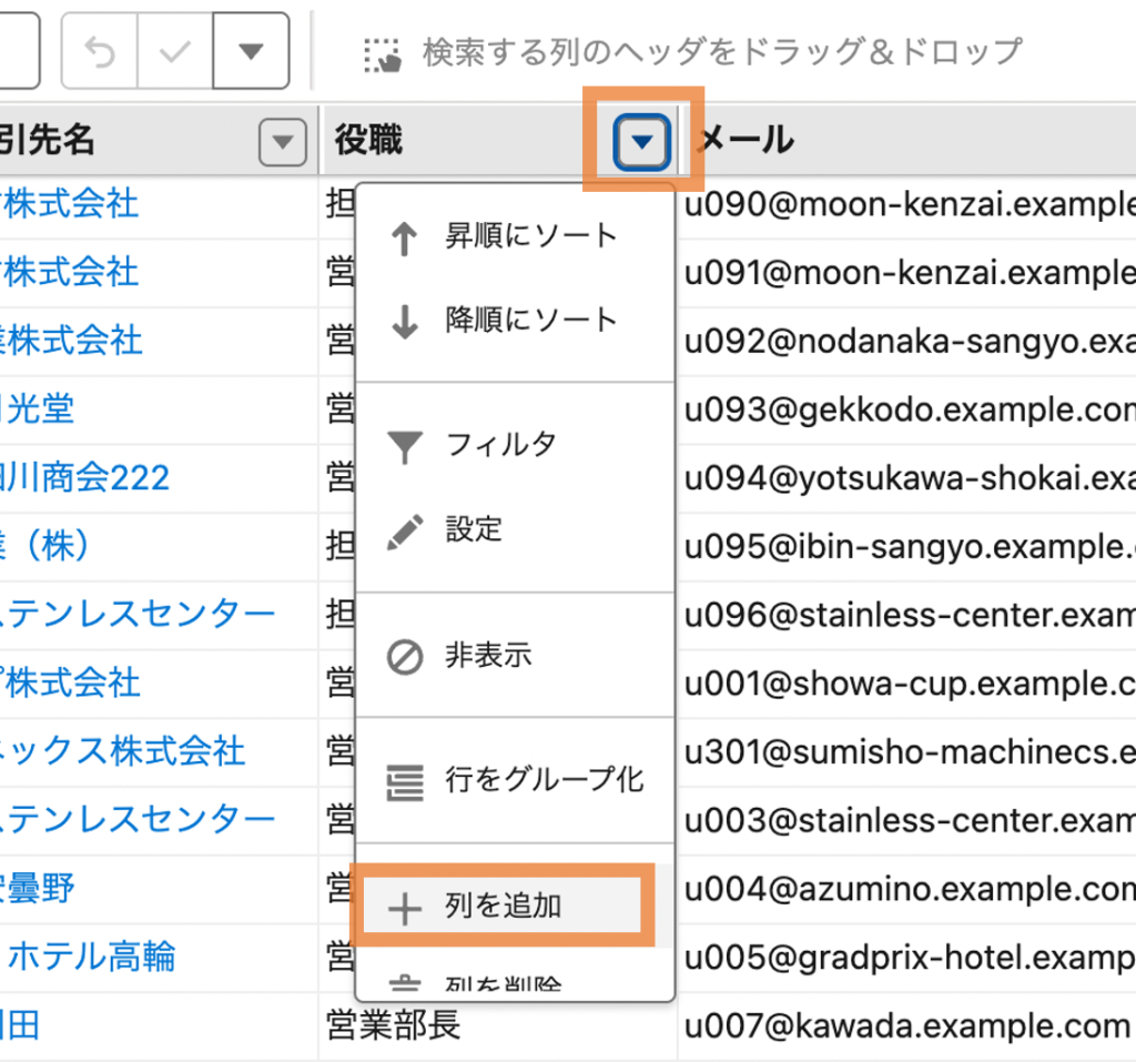 ① 列ヘッダーメニュー(▼)をクリックし、「+列を追加」を選択