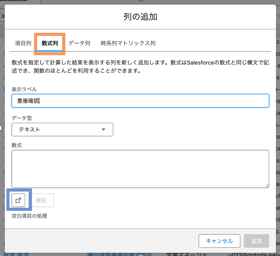 ②列の追加ダイアログが表示されるので、数式タブをクリック