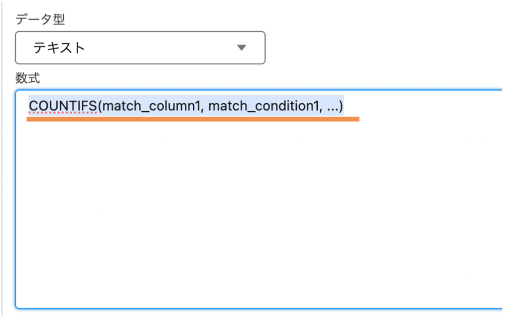 COUNTIFS関数(COUNTIFS(match_column1, match_condition1, …)) が表示されました。次に「検索条件範囲と検索条件」を設定します。