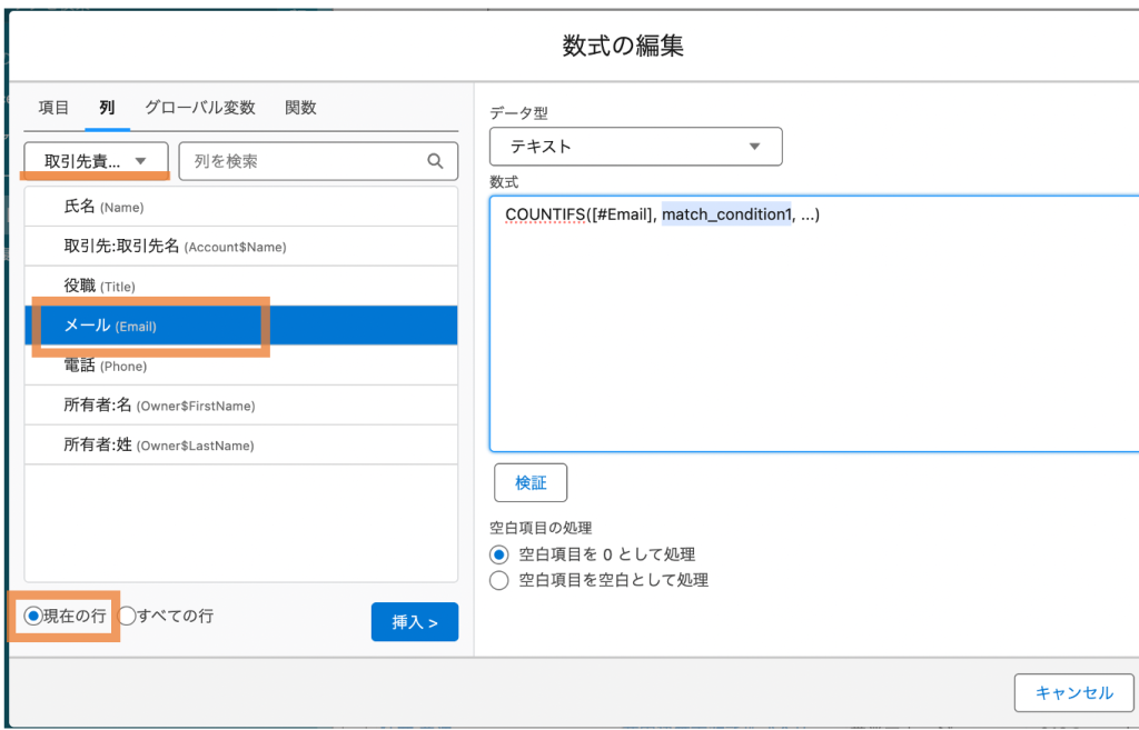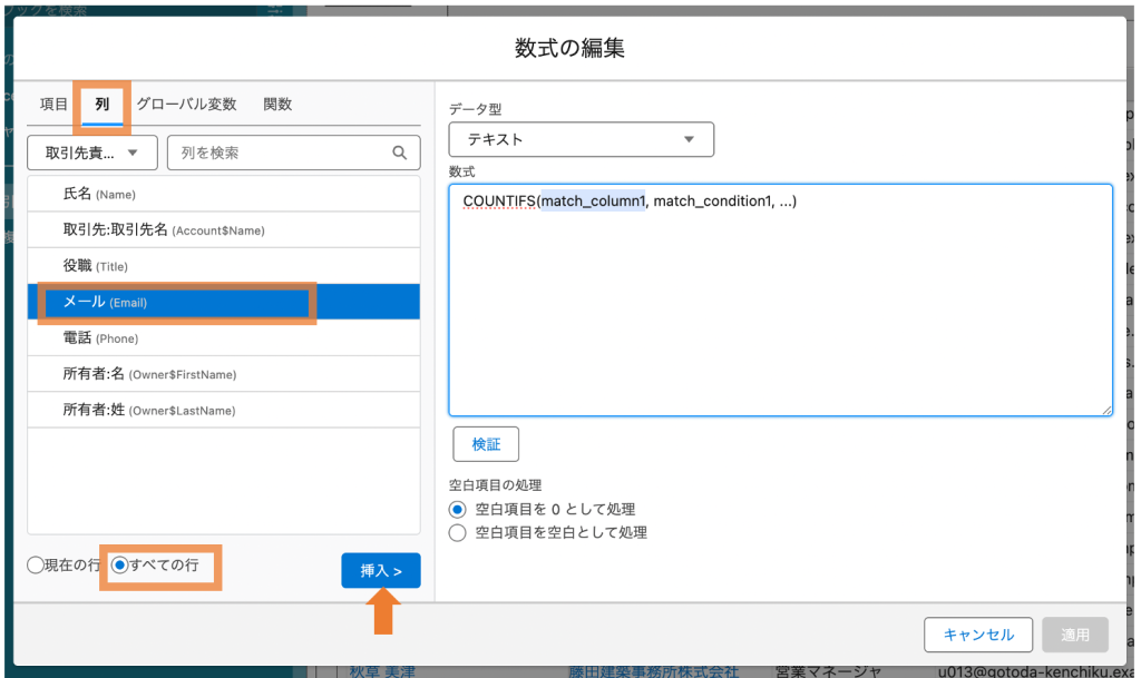 具体的には、「取引先責任者」シートの「メール」列の値が同じものの件数を集計し、表示する数式列を設定します。