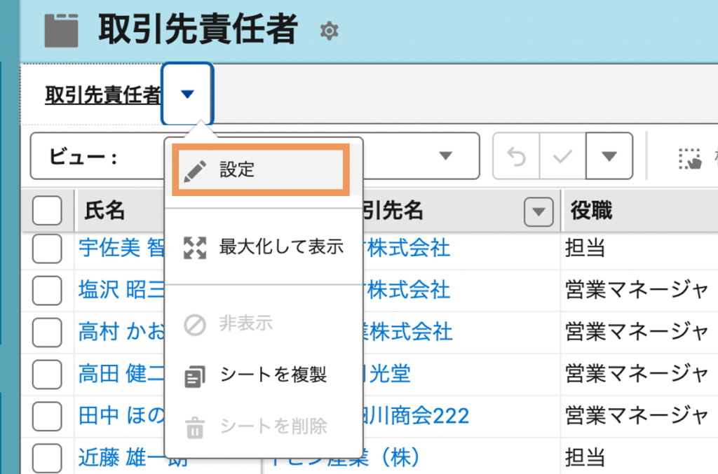 1.「取引先責任者」シートのシートメニュー(▼)をクリックし、「設定」を選択する