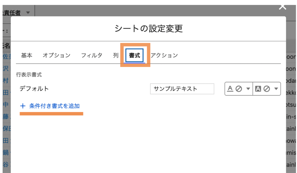 2.シートの設定変更ダイアログが表示されるので、「書式」タブを開き、「+条件付き書式を追加」をクリックする