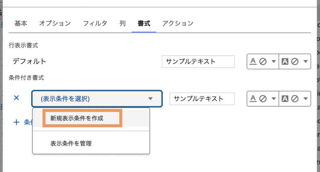 3.「条件付き書式」セクションから、「(表示条件を選択)」をクリックし、「新規表示条件を作成」を選択
