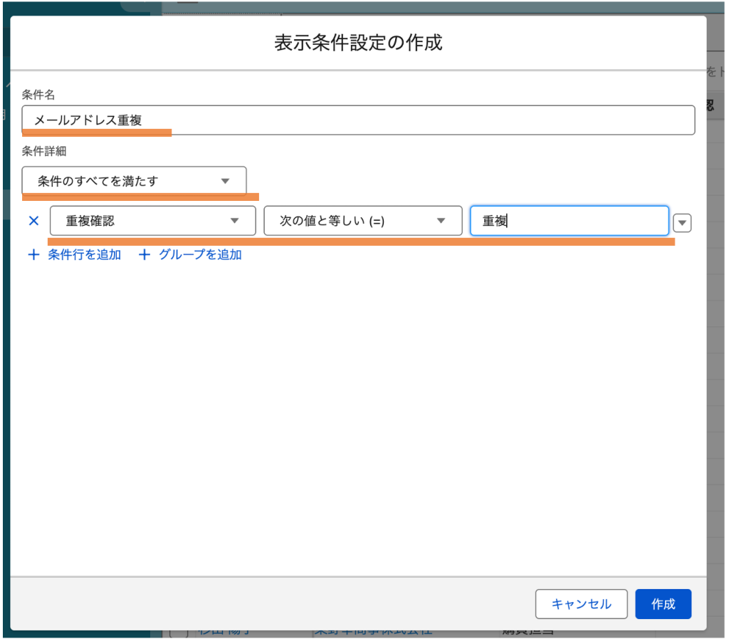 4.表示条件作成ダイアログが表示されるので、「条件名」「条件詳細」を以下のように設定し、作成をクリックする