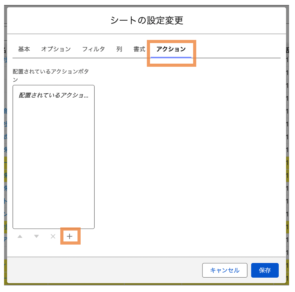 ②シートの設定変更ダイアログが表示されるので、アクションタブを開いて、アクションボタンを追加(+)ボタンをクリックする