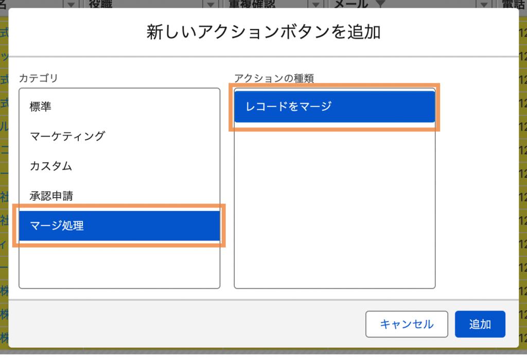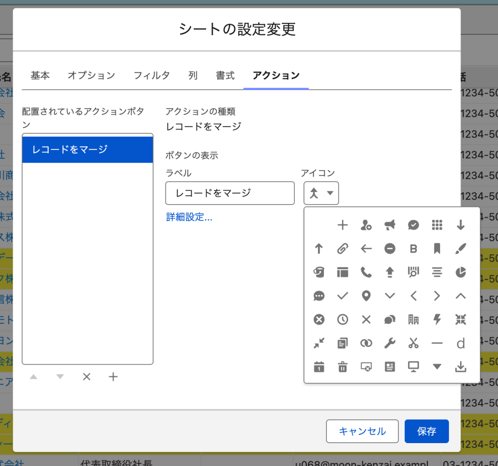 ④配置されているアクションボタンに「レコードをマージ」を選択し、ラベル名・アイコンを選び、保存をクリックする