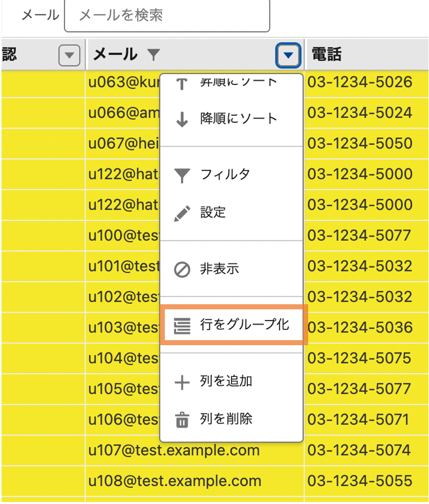 「メール」列の列ヘッダメニューをクリックし、行をグループ化を選択します。