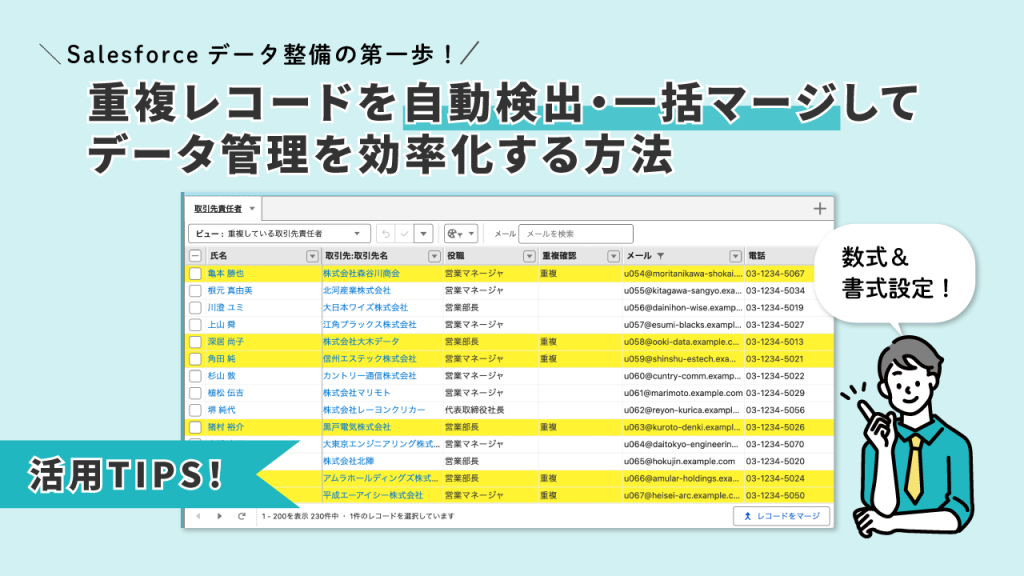 具体的には、「数式(関数)」と「条件付き書式設定」を組み合わせることで、Salesforce内の重複レコードを自動で見つけて、すぐにわかるように可視化するテクニックを詳しく解説していきます。さらに、見つけた重複データを「一括マージ機能」を使って、安全かつスピーディーに統合・解消する、とても実用的なステップまでもしっかりカバーします。