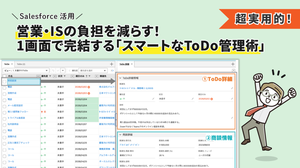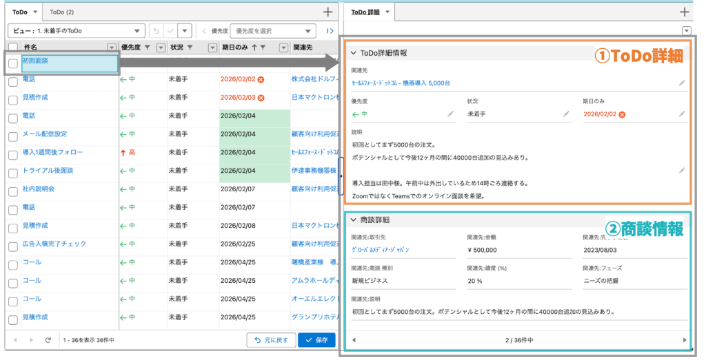 さらに便利なのが、右下パネル(②)の表示です。ここには、ToDoに紐づいている関連先(例:商談)の情報を表示しています。
