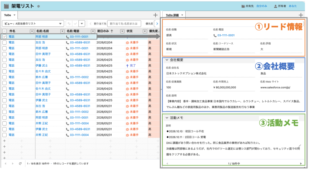リードや取引先責任者の「電話番号」はもちろん「役職」や「部署」といった項目を並べて表示できます(右上パネル①)