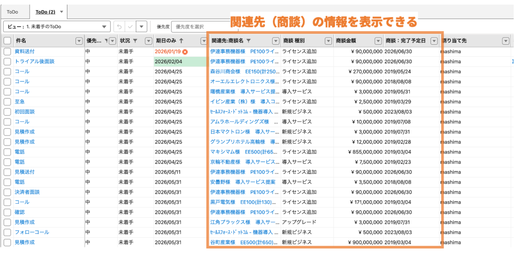 標準のToDoリストでは「関連先名」はわかっても、その商談の金額や完了予定日までは分かりません。Mashmatrix Sheetなら、ToDoに紐づいている「商談」や「取引先責任者」の項目を、同じ行の列として自由に追加できます。