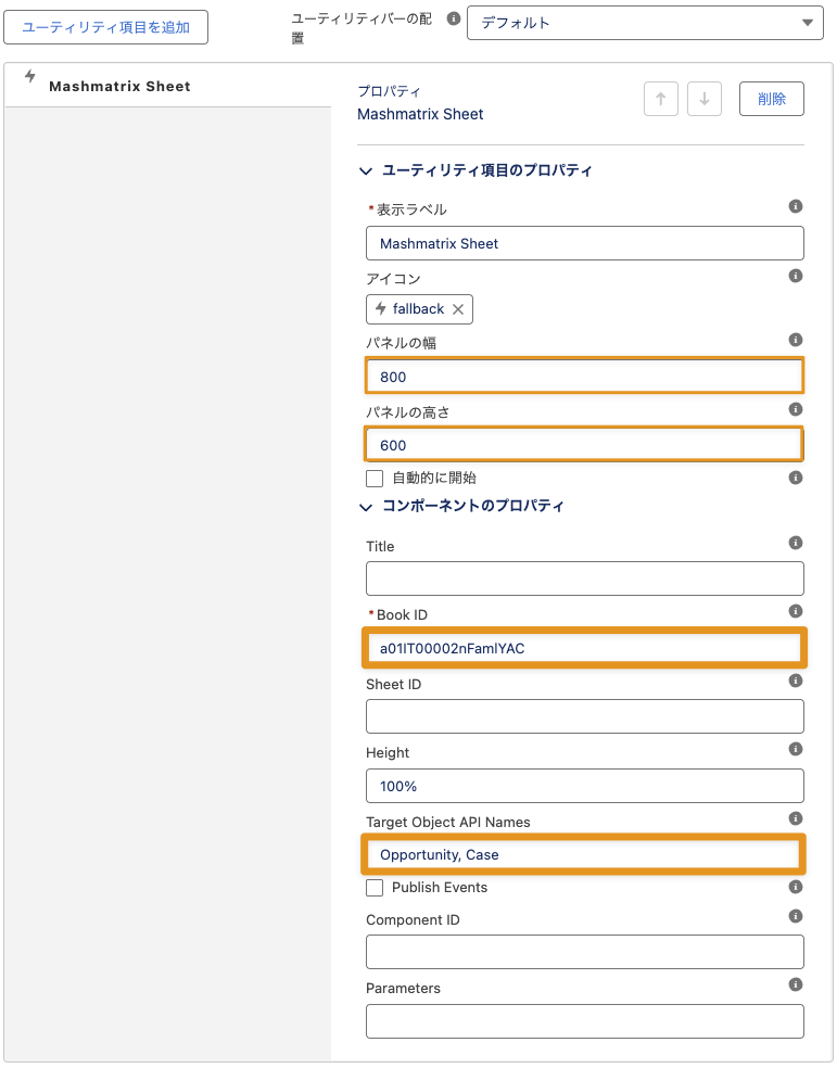 ユーティリティ項目とコンポーネントのプロパティ設定で、以下の項目を入力する