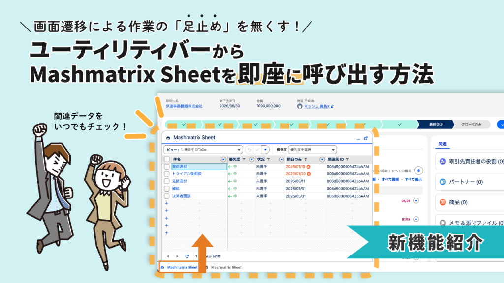 今回は、Mashmatrix Sheetの新機能「ユーティリティバー内でのSheetコンポーネント利用」についてご紹介しました。Salesforce標準機能の便利なツールであるユーティリティバーにMashmatrix Sheetを追加することで、レコード画面から直接「関連データの一覧表示・編集」ができるようになりました。