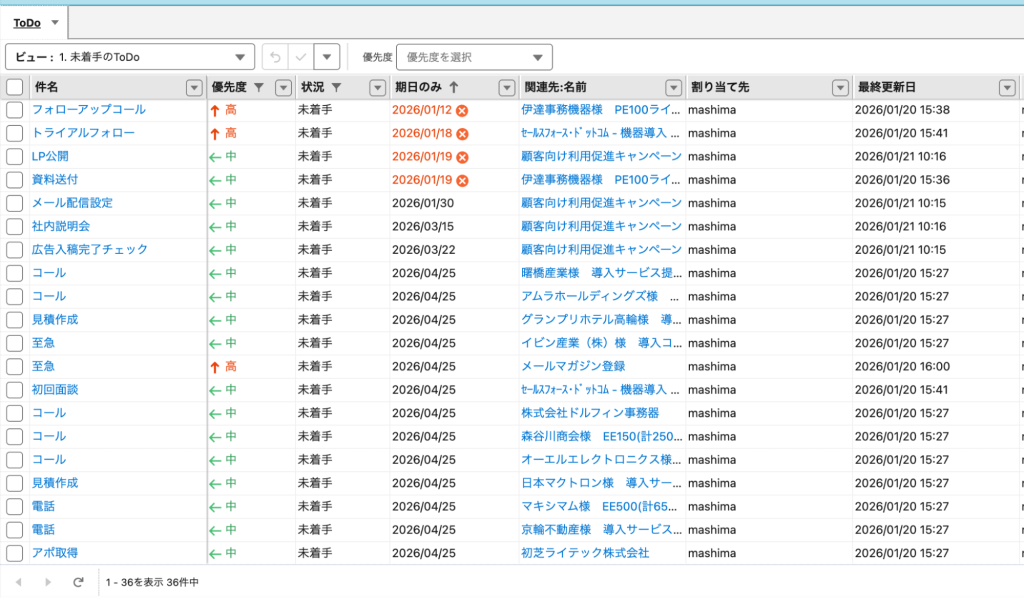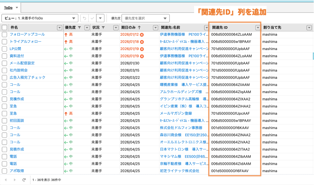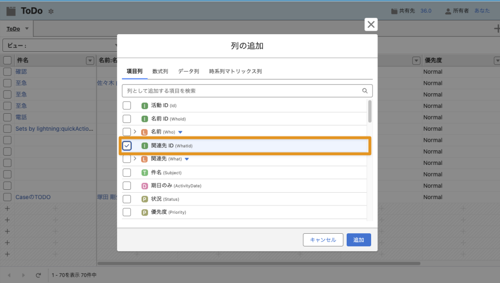 - 表示しているレコードに関連するToDoのみを表示するために、ToDoシートに関連先ID「WhatId」の列を追加してフィルタを設定する