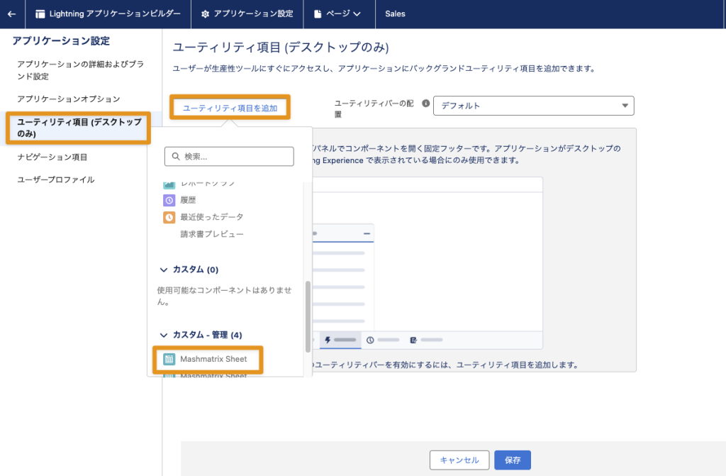 それでは、実際にユーティリティバーでMashmatrix Sheetを表示する設定を進めていきましょう。今回は例として、セールスアプリケーション(API参照名:LightningSales)にユーティリティ項目として「ToDoシート」を追加します。