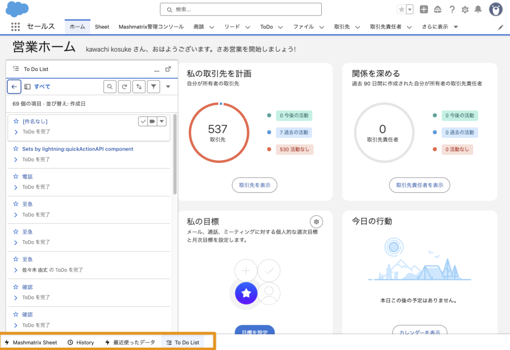 画面下部のユーティリティバー内の「Mashmatrix Sheet」をクリックすると、表示しているレコードのオブジェクト(商談・ケース)に関連するToDoが表示されるようになりました。